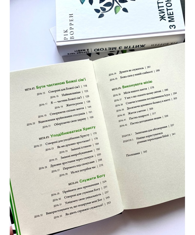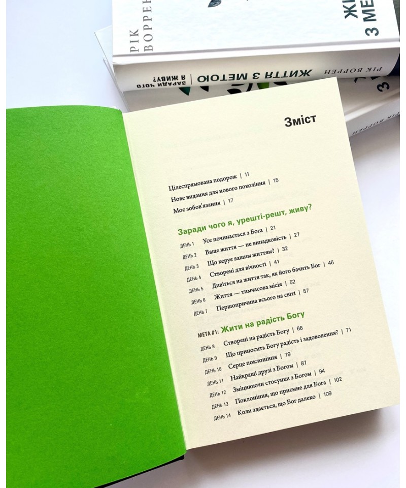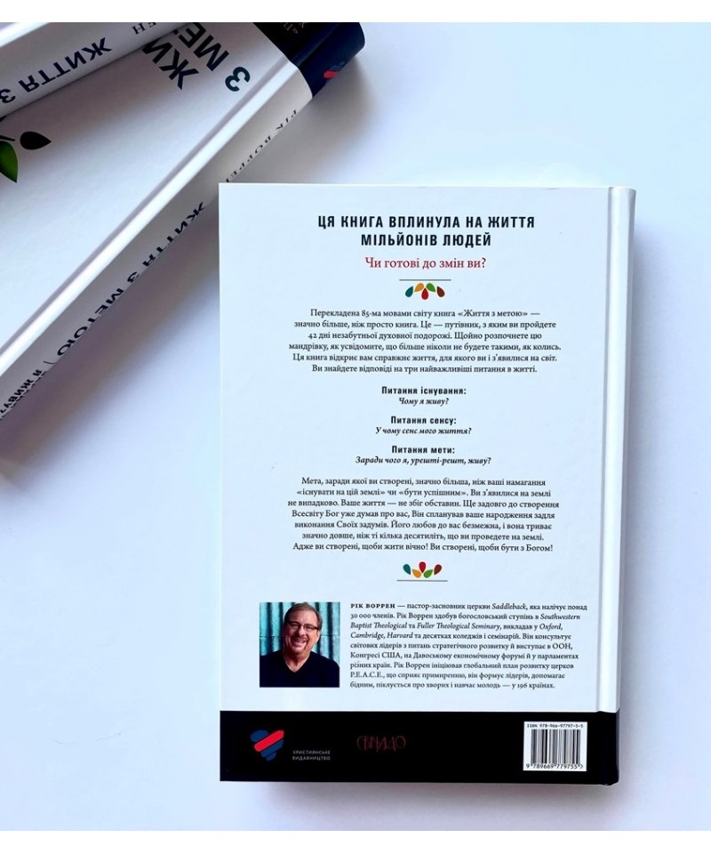 Перекладена 85-ма мовами світу, книга «Життя з метою» — значно більше, ніж просто книга. Це — путівник, з яким ви пройдете 42 дні незабутньої духовної подорожі. Щойно розпочнете цю мандрівку, як усвідомите, що більше ніколи не будете такими, як колись. Ця книга відкриє вам справжнє життя, для якого ви і з’явилися на світ. Ви знайдете відповіді на три найважливіші питання в житті.