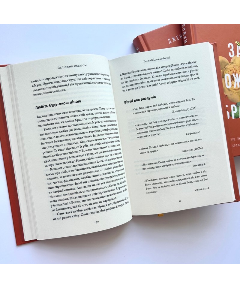 Джен Вілкін допомагає читачам побачити, якими мають бути люди, котрі прагнуть відображати у власному житті образ свого Творця. У книзі «За Божим образом» авторка досліджує 10 якостей Божого характеру, які християни покликані наслідувати: бути святими, люблячими, справедливими, добрими, милосердними, благодатними, вірними, терплячими, правдивими та мудрими. Ця книга закликає читачів пізнати мету свого життя і стати тими людьми, якими їх задумав Бог.