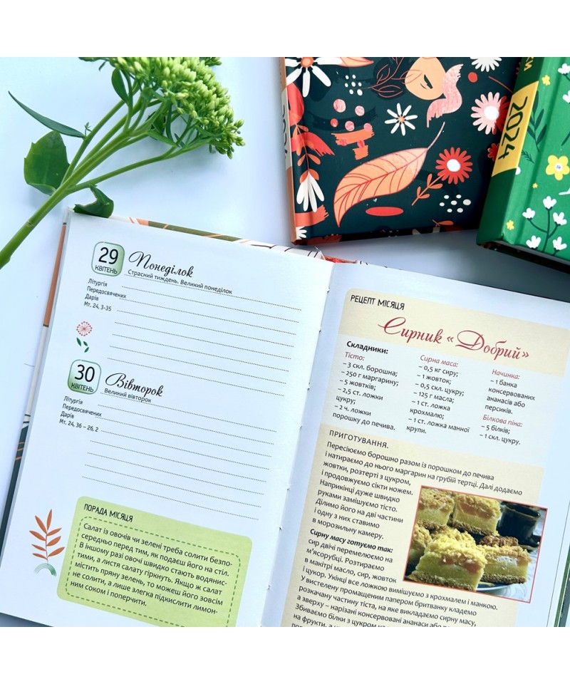 Календар-щоденник неодмінно стане в пригоді жінкам, які потребують записувати свої плани. Сторінки щоденника наповнені цитатами, корисними порадами, щоденними читання зі Святого Письма, кулінарними рецептами. Календар допоможе впорядкувати справи та думки і стане джерелом Ваших планів, мрій та натхнення.