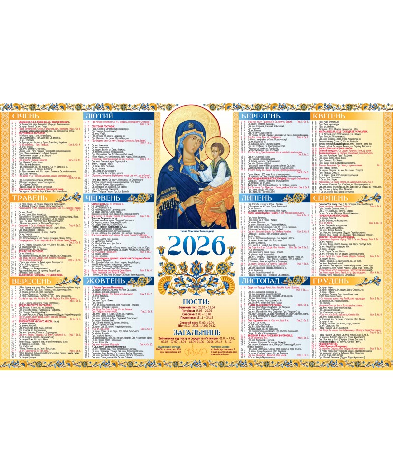 Настінний церковний календар на 2026 рік малого формату. Він допоможе Вам зорієнтуватися на який день припадає Великдень у 2026 році, перехідні та неперехідні церковні свята, коли дозволена будь-яка їжа, коли розпочинаються та закінчуються пости. Він також нагадає вам про святих Церкви і допоможе не забути привітати іменинників.