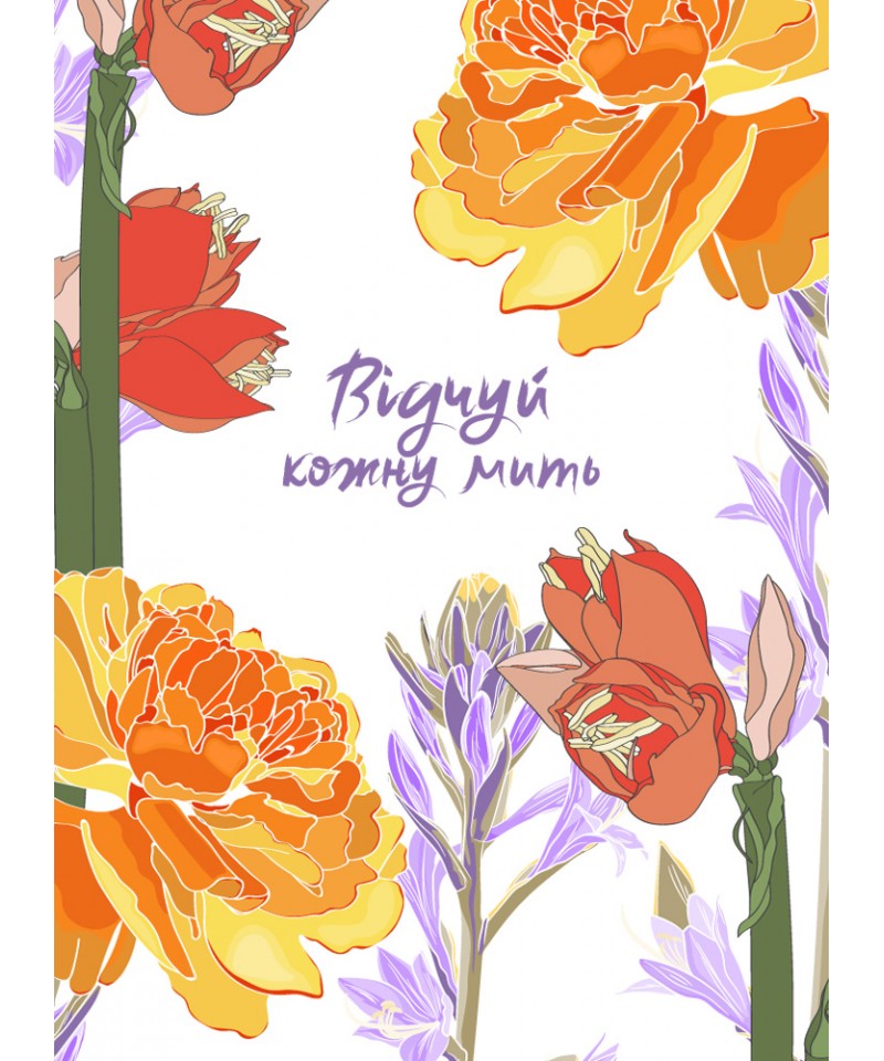 Іноді досить однієї миті, щоб зробити несподіване відкриття: про світ, про нібито звичайні речі, про те, що насправді цінне, та навіть про себе. Збережи цю мить! А оскільки таких митей у тебе багато – адже так? – тобі потрібно багато чистих сторінок і... натхнення. Ти неодмінно почерпнеш його з влучних цитат, вміщених тут, і з квіткових фантазій художниці Юлії Хвищук. Більше про її творчість – на сторінці в інстаграмі floralpatterndesign.