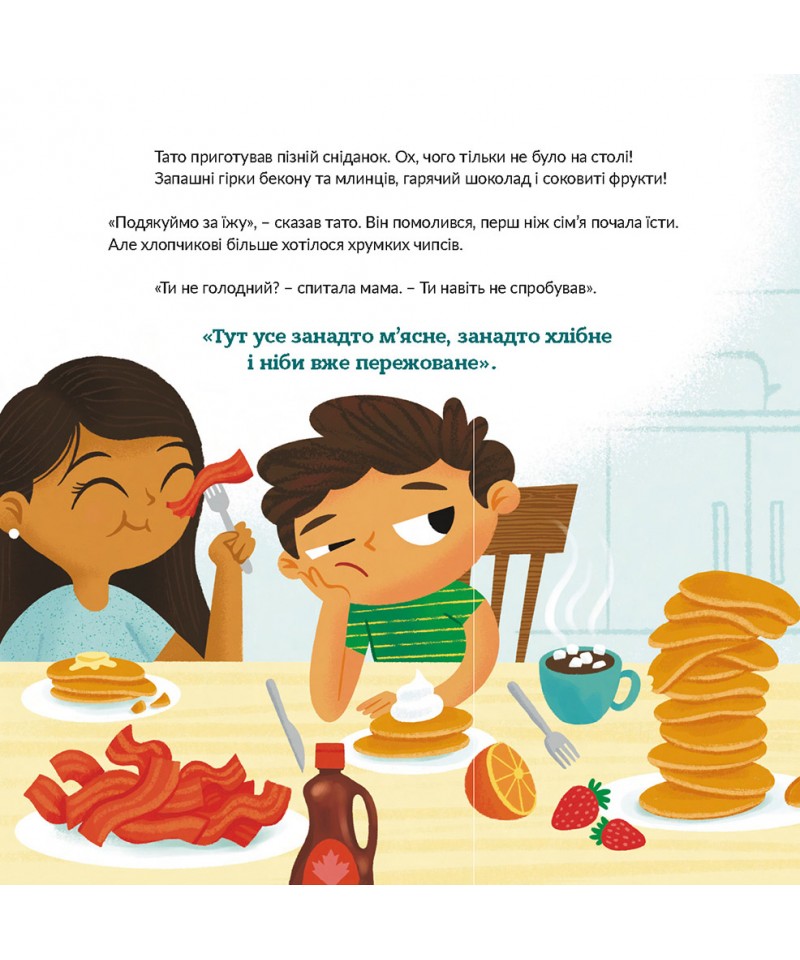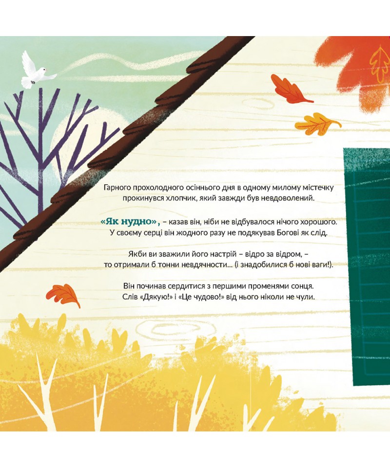 Гарного морозного дня в одному милому містечку прокинувся хлопчик, який завжди був незадоволений. Тільки прокинувшись, герой цієї книжки починає нарікати. Сонце для нього надто яскраве, млинці йому не до смаку і взагалі – все жахливо нудне. Він не розуміє, чому інші діти чудово проводять час, аж поки його очі не відкриваються на дивовижно створений Богом світ. Тоді він починає бачити те, чого не помічав раніше, і вчиться бути вдячним.
