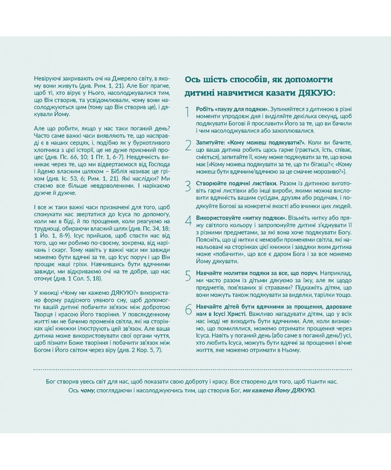 Книжка Чемп Торнтон “Чому ми кажемо дякую?” допоможе виховати почуття вдячности у дітей і підкаже батькам, як дитина може використовувати свої почуття, щоб відчути Боже творіння і побачити зв’язок між Богом і Його світом через віру.