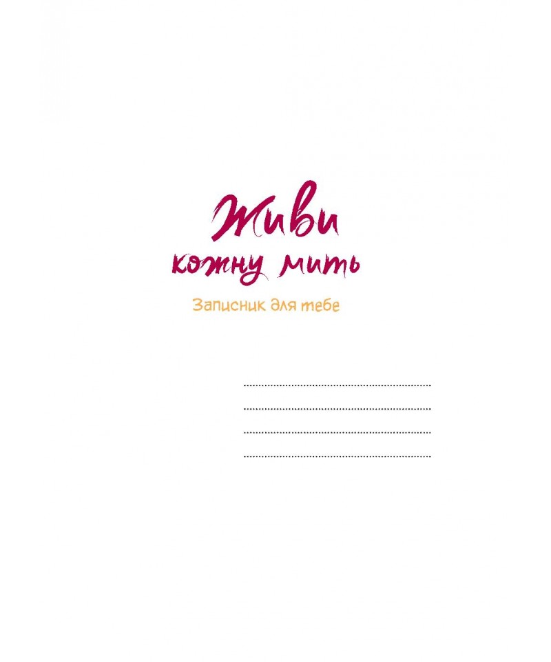 “Живи кожну мить” - третє видання із серії наших барвистих недатованих записників. Два попередні - “Цінуй кожну мить” та “Відчуй кожну мить”. Усе, чим наповнені сторінки нового щоденника, заохотить вас жити уповні – з радістю, з натхненням, з любов’ю та відкритим серцем. Заплануйте ділову зустріч, приємне спілкування за кавою, мандрівку чи якусь важливу справу – записник допоможе приготуватися до цієї події. Тут гармонійно поєднуються слова, образи та емоції і багато простору для ваших думок і спостережень.