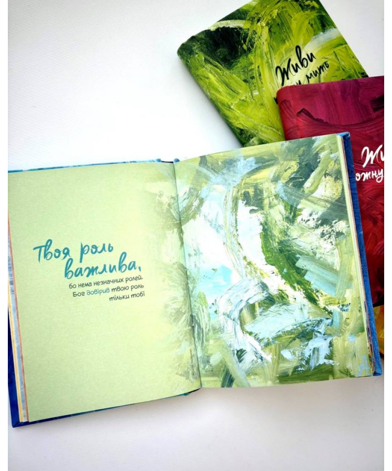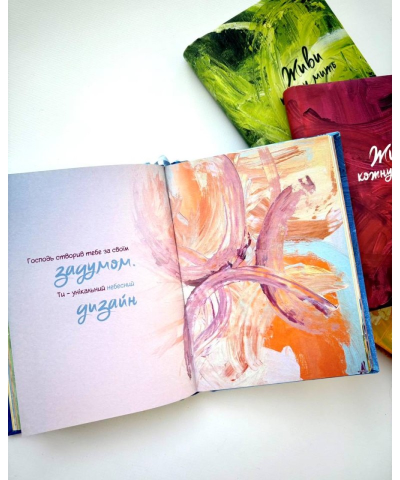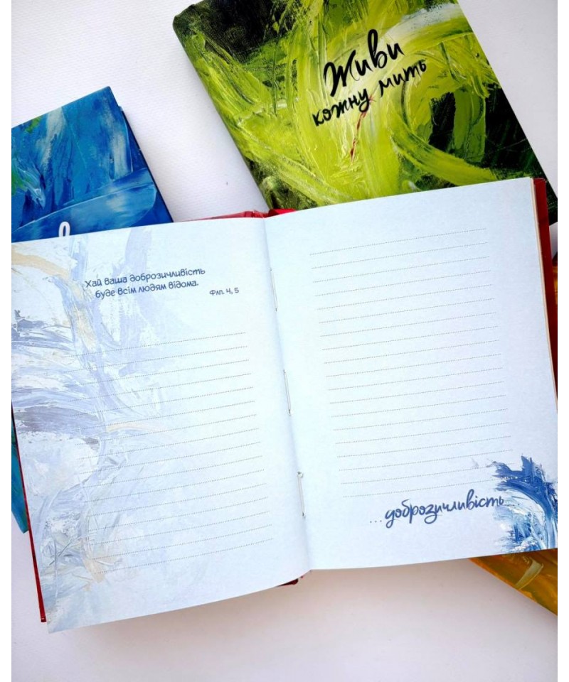 Записник “Живи кожну мить” проілюстрований картинами Андріани Чухній. Ця обдарована художниця зі синдромом Дауна працює у техніці модернового імпресіонізму. У творчому доробку Андріани більше 120 картин, які побували на виставках не лише в Україні, але й за її межами. Андріана співпрацює з першим в Україні інклюзивним ательє Lady Di Atelier. Це бренд, який всім серцем вірить у таланти художників з інвалідністю і допомагає їх реалізувати.