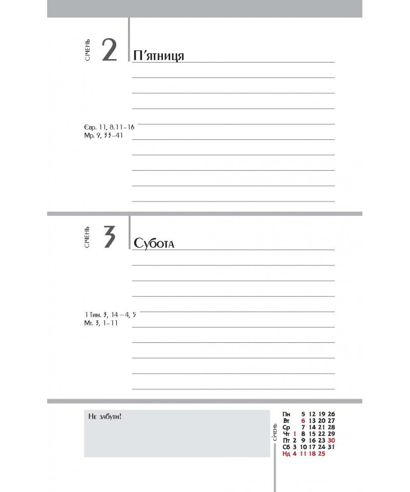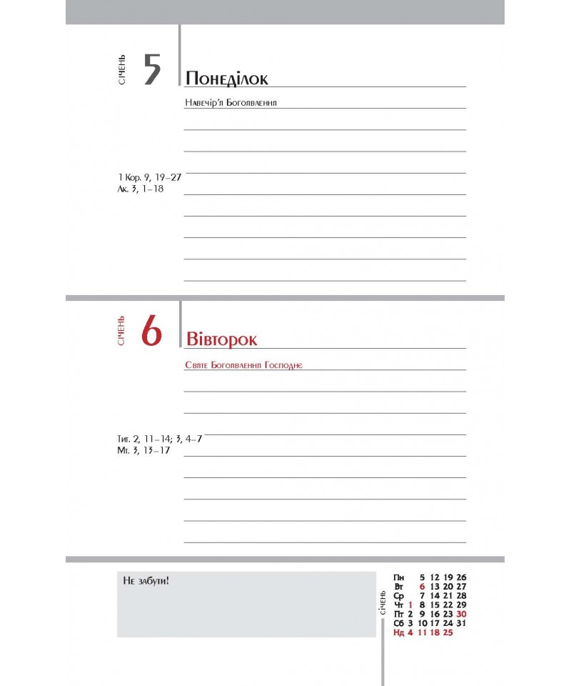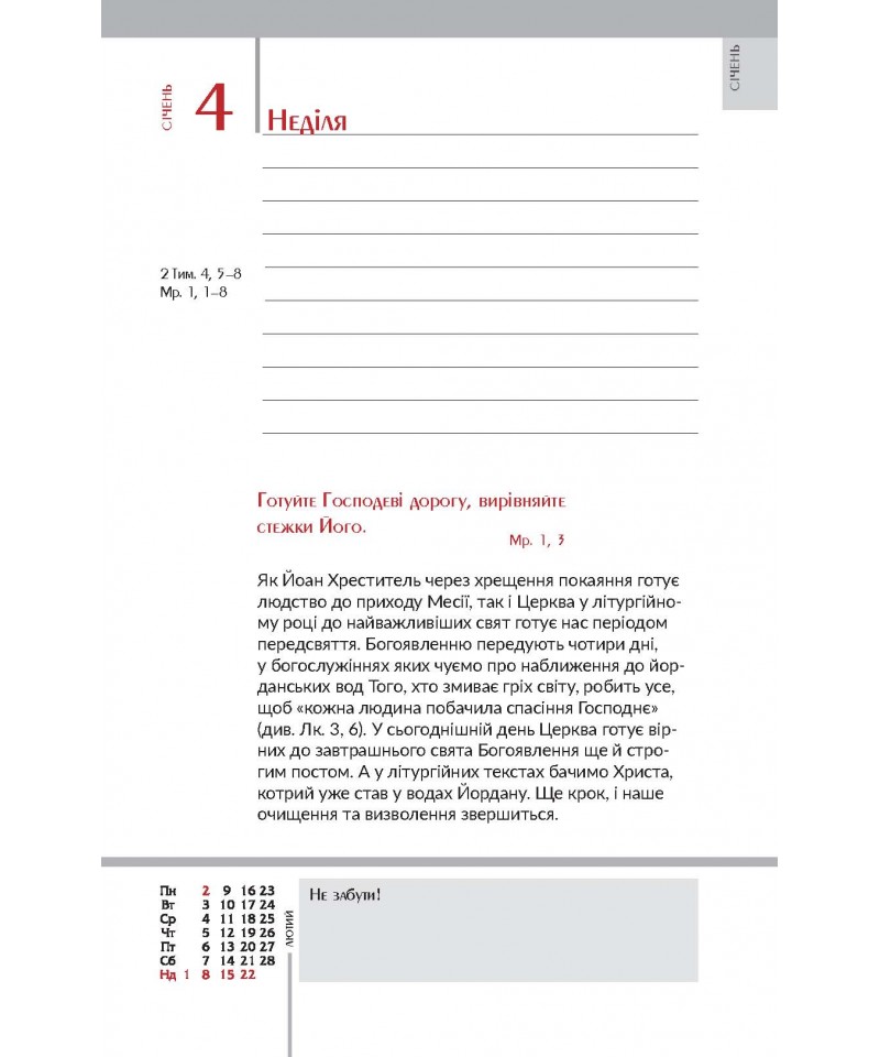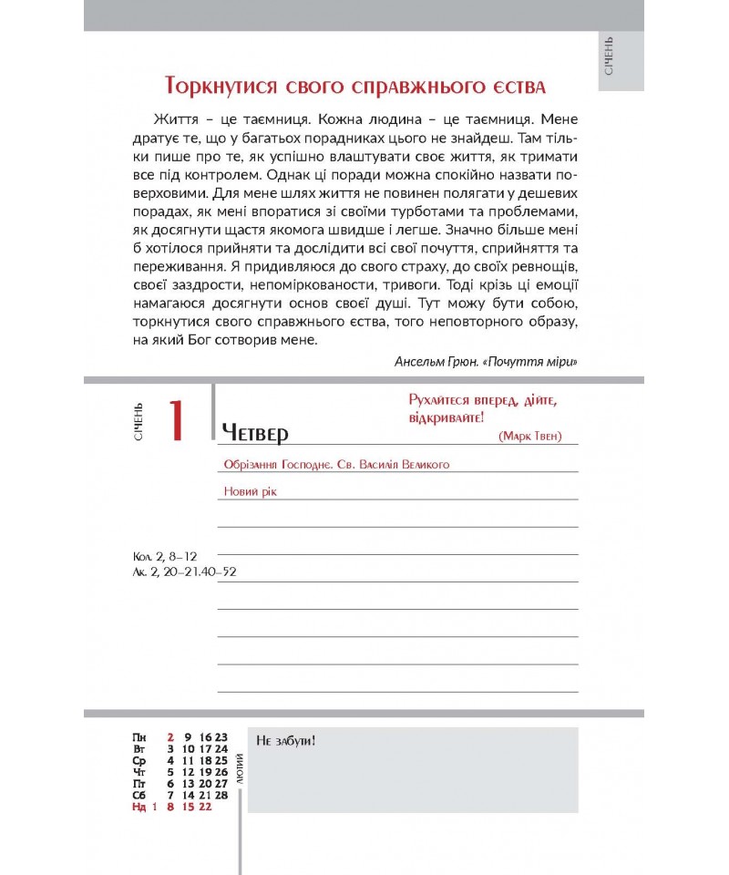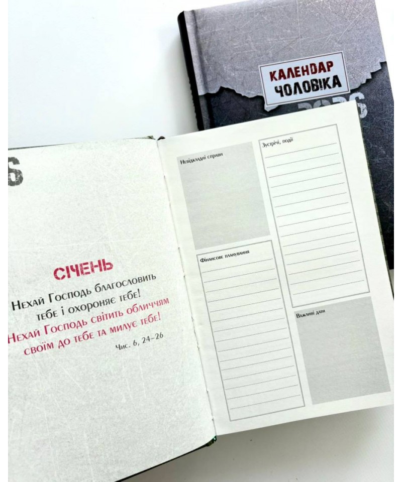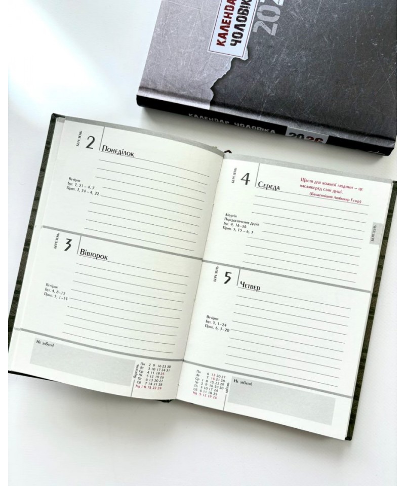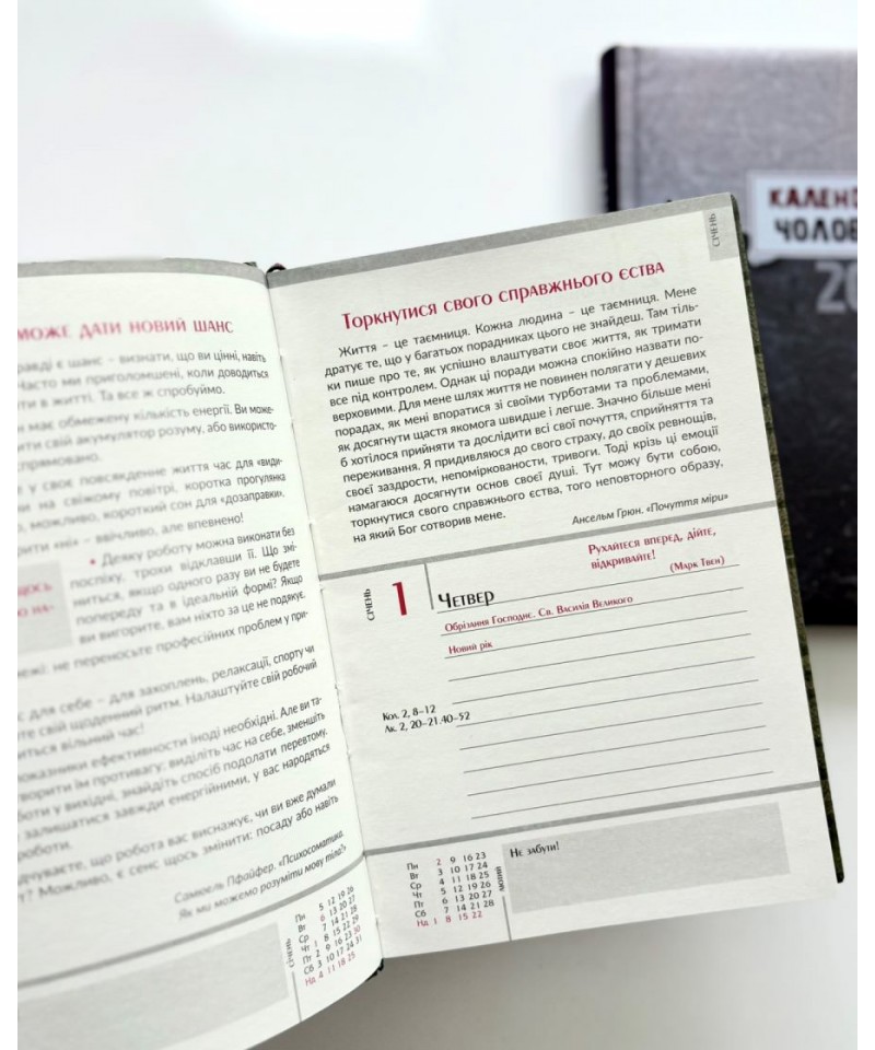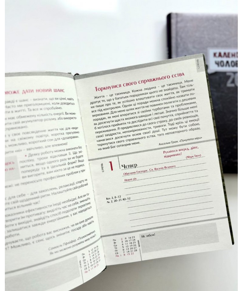 Влучні цитати, цікава інформація, коментарі до недільних читань Святого Письма богослова та журналіста Василя Калити — усе це в зручному календарі-щоденнику з твердим чоловічим характером.