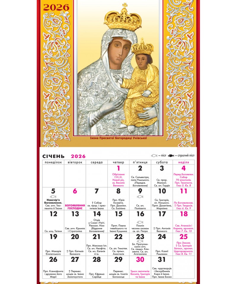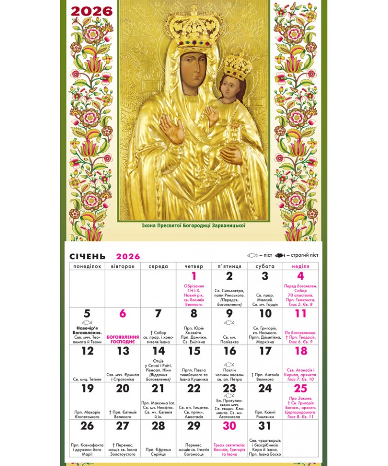 Відривний церковний календар на 2026 рік. Він допоможе Вам зорієнтуватися на який день припадає Великдень у 2026 році, перехідні та неперехідні церковні свята, коли дозволена будь-яка їжа, коли розпочинаються та закінчуються пости. Він також нагадає вам про святих Церкви і допоможе не забути привітати іменинників.