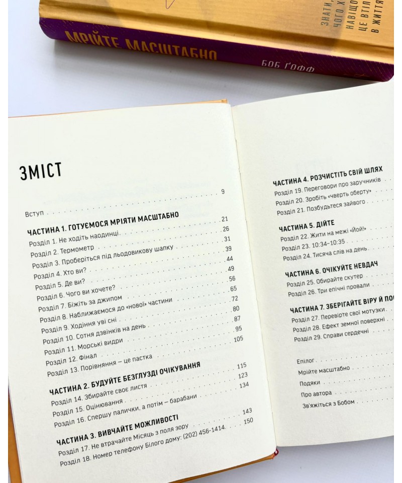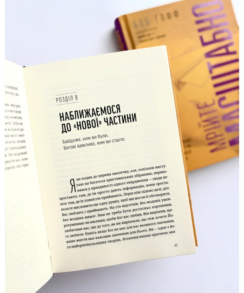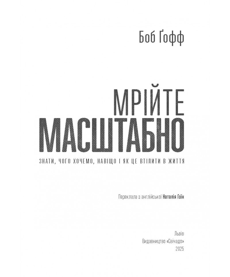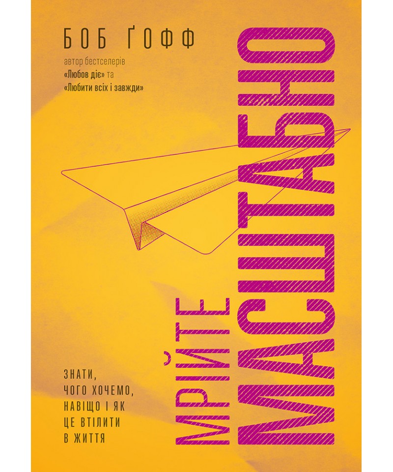 Книжка «Мрійте масштабно» – це відверта, соковита і дотепна розповідь уже добре знайомого нам автора бестселерів Боба Ґоффа про його життя, з успіхами, провалами й іноді карколомними спробами досягти своїх мрій. Розповідаючи про цей досвід, Боб Ґофф запевнює, що довкола є чимало підказок, як жити насичено і змістовно. На сторінках книжки автор ділиться і своїми підказками, які допоможуть рухатися до втілення найсміливіших прагнень.
