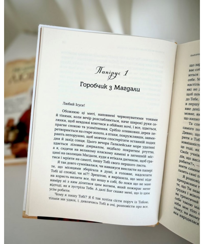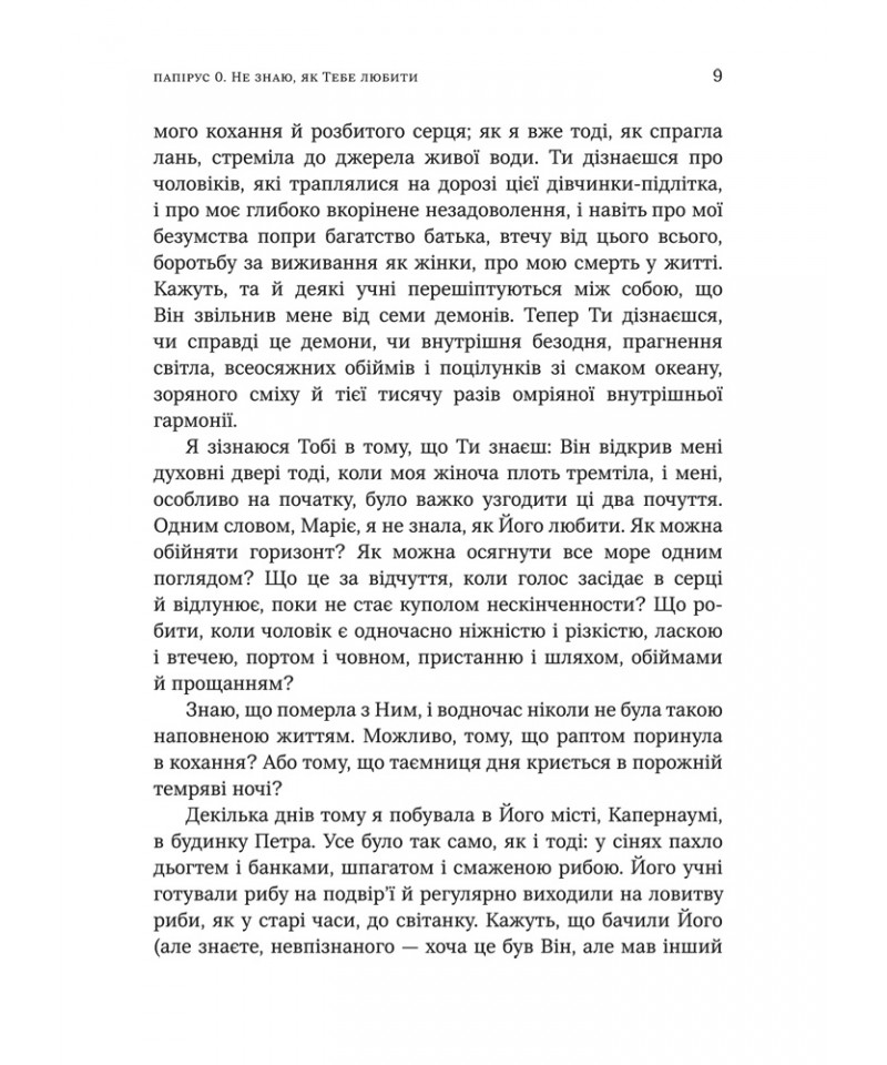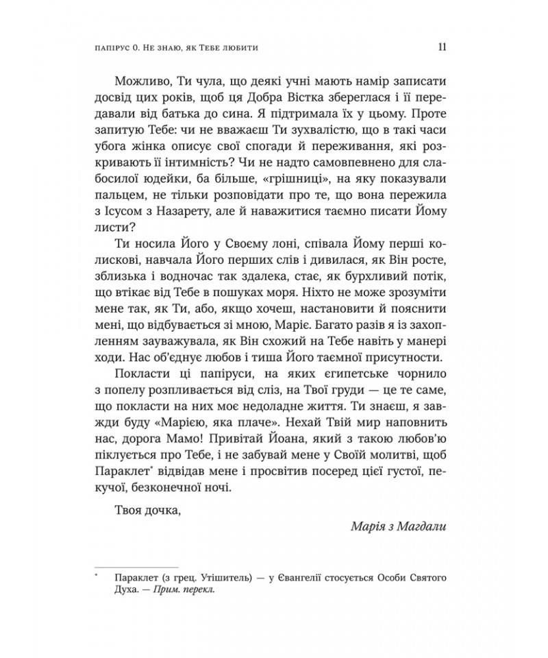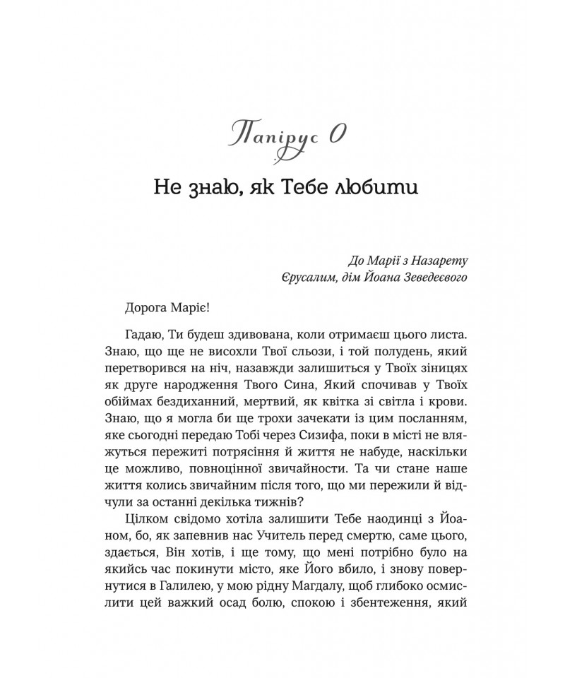 У цій книжці Марія Магдалина постає як неспокійна безперервна шукачка істини, яка намагається, наскільки це можливо, навчатися у вчителів і мислителів, яких зустрічає на своєму шляху, поки нареші не відкриває для себе Ісуса, пишучи йому листи.