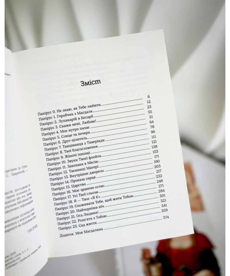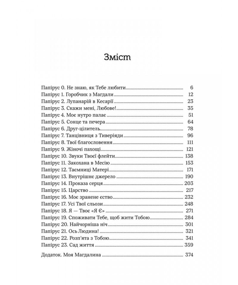 Марія Магдалина — одна з найпопулярніших і водночас найтаємничіших постатей Святого Письма. Її ім'я пов'язане з багатьма версіями, дослідженнями, дискусіями, сюжетами у літературі та мистецтві. Цей роман — ще один оригінальний твір, у якому автор прагне відтворити образ святої, заповнюючи прогалини біблійних тексті штрихами літературної творчості, послуговуючись інформацією з Євангелій.