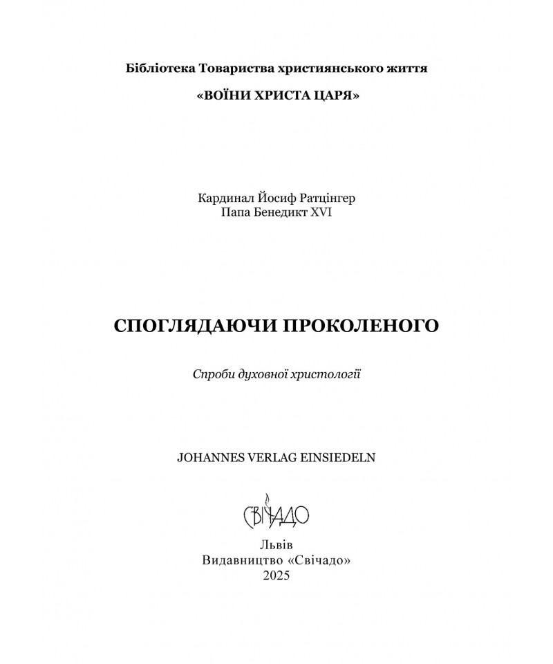 У книзі “Споглядаючи проколеного: Спроби духовної христології” кардинал Йосиф Ратцінгер зібрав у єдине видання власні роздуми і розважання на христологічну тематику, які сам називає лише спробами духовної христології, але насправді вони допоможуть читачам зануритися у богословське розуміння споглядання Христа, Його жертви і її плодів у житті Церкви.