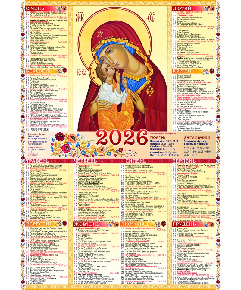 Настінний церковний календар на 2026 рік великого формату. Він допоможе Вам зорієнтуватися на який день припадає Великдень у 2026 році, перехідні та неперехідні церковні свята, коли дозволена будь-яка їжа, коли розпочинаються та закінчуються пости. Він також нагадає вам про святих Церкви і допоможе не забути привітати іменинників.