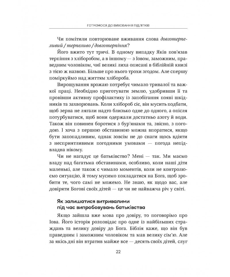 У цій книжці сімейна консультантка й мама трьох дітей Крістен Гаттон допомагає батькам активно взаємодіяти зі своїми дітьми, коли вони малі, аби потім, у подальші роки, бути готовими до змін та викликів. Незалежно від того, скільки років вашій дитині — два чи, можливо, вже дванадцять — кожен батько чи мати почерпне тут важливі знання, оперті на християнські цінності, які допоможуть їй подолати страхи та невпевненість, краще підготуватися до реального тиску однолітків та ухвалення рішень. Це своєрідний дороговказ для батьків, що зміцнює, гартує і заохочує у непростій, але благодатній справі виховання дітей.