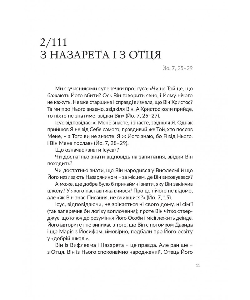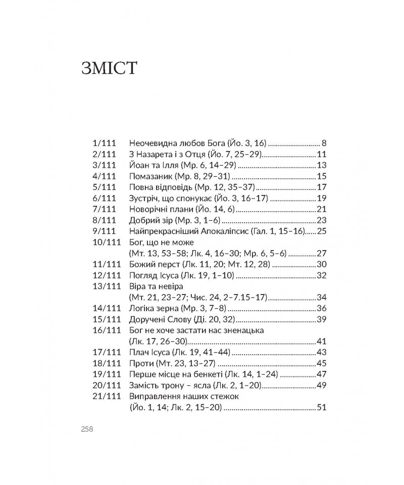 Книжка містить 111 розважань до текстів Святого Письма. Їх автор, кардинал Ґжеґож Рись, пропонує лаконічну і змістовну інтерпретацію біблійних уривків, підкріплюючи прикладами з Нового Завіту свої міркування про природу людського духа, а також – про одвічне протистояння правди і фальші, чесности і лицемірства, жорстокости і милосердя. Глибоко, влучно й водночас просто – ця особливість авторського стилю робить книжку притягальною і заохочує до щоденного спілкування зі Святим Письмом.