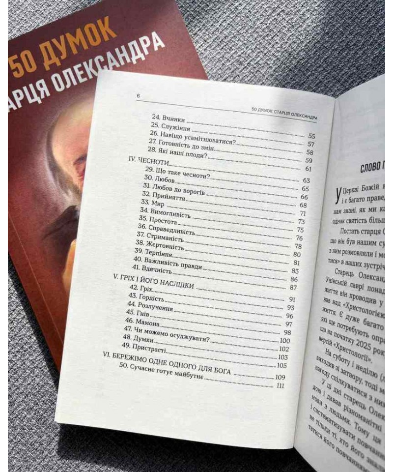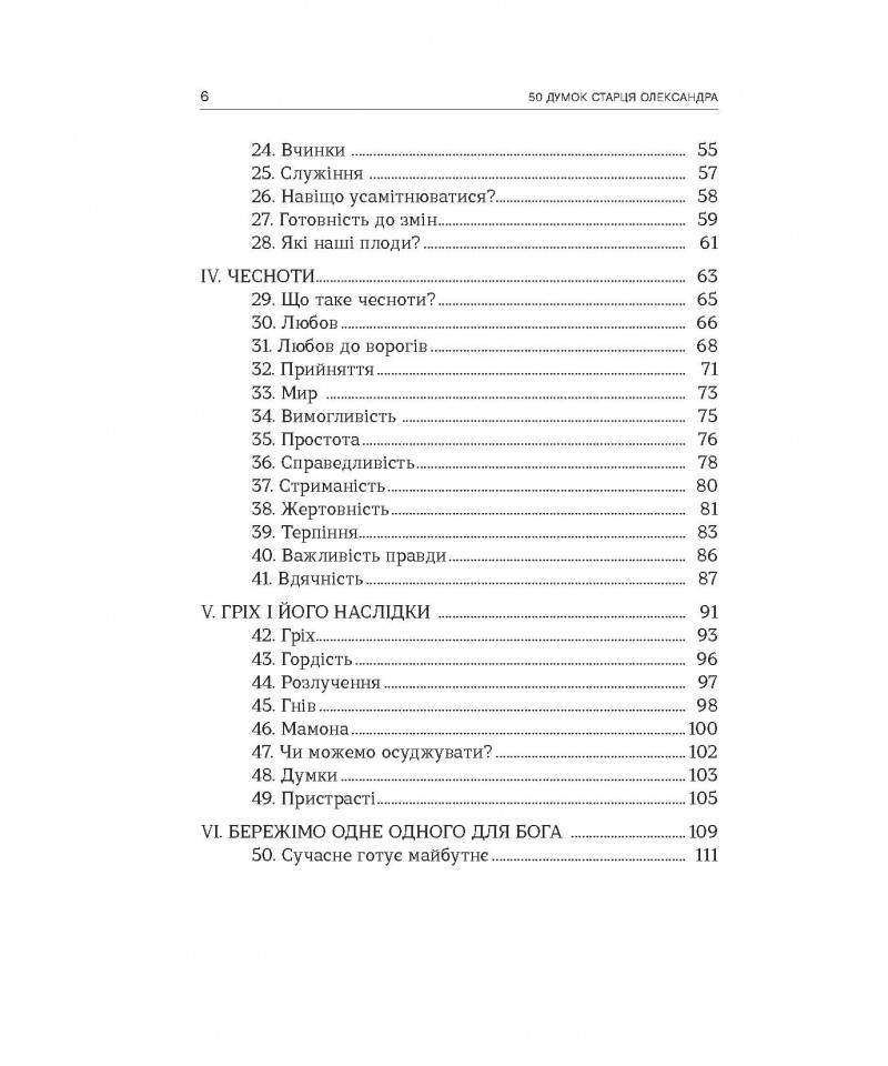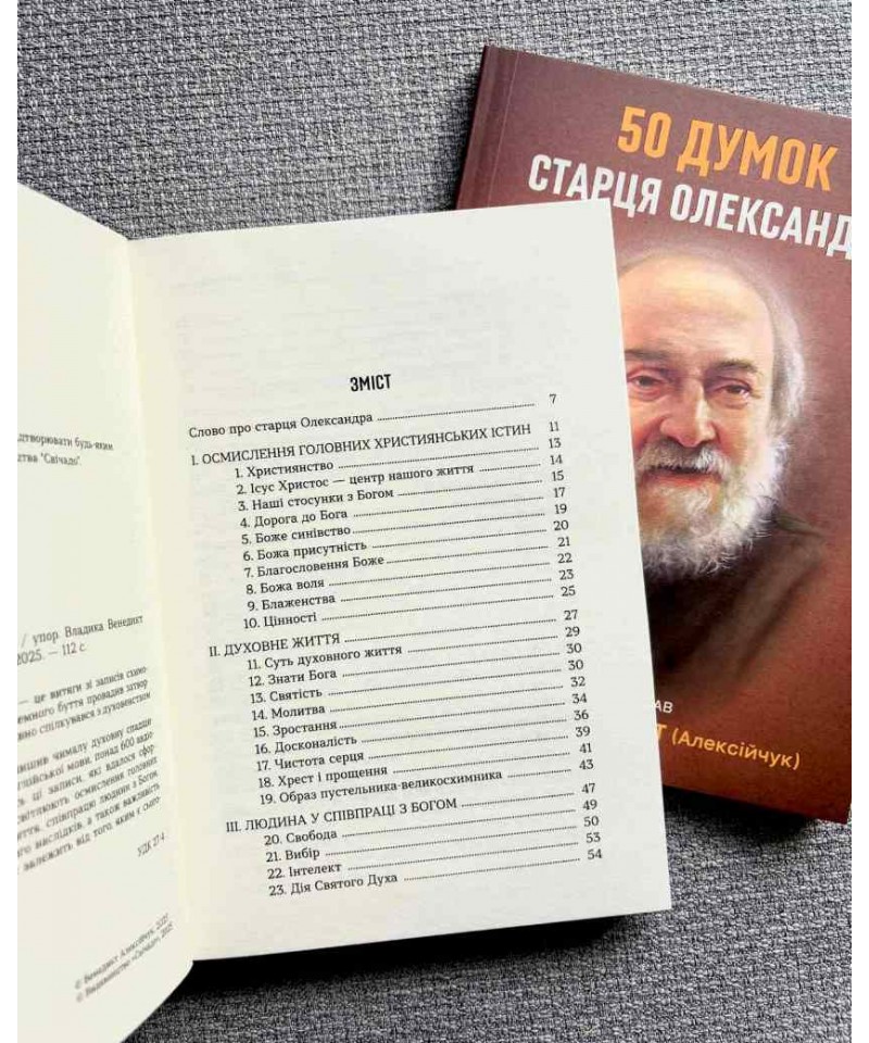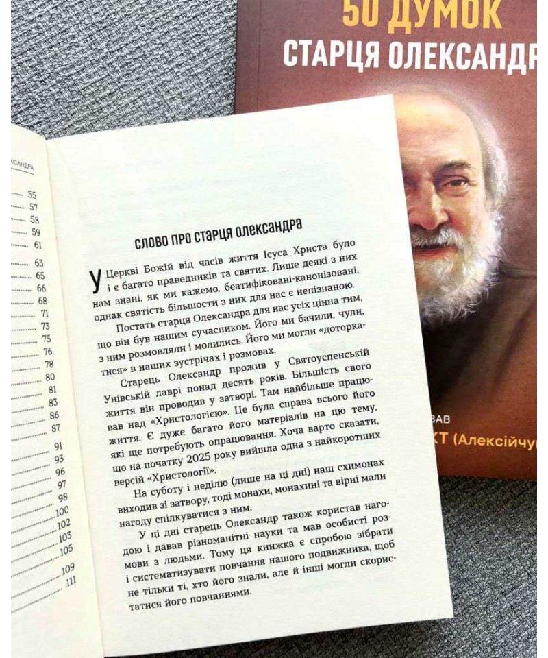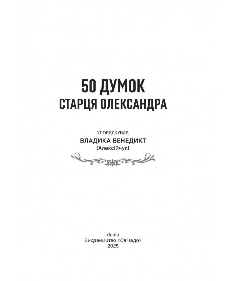 «50 думок старця Олександра» – це витяги зі записів схимонаха. Вони сформовані у шість розділів, що висвітлюють осмислення головних християнських істин, духовне життя, співпрацю людини з Богом, сутність чеснот, аналіз гріха і його наслідків, а також важливість усвідомлення того, що майбутнє залежить від того, яким є сьогодення.