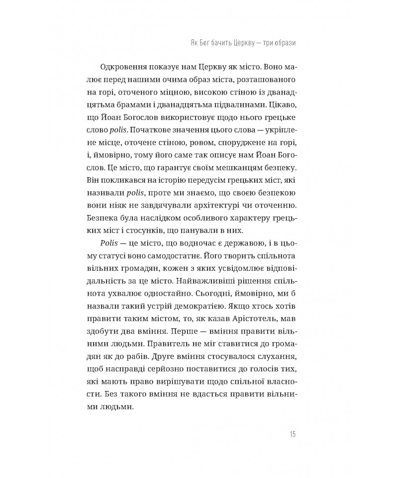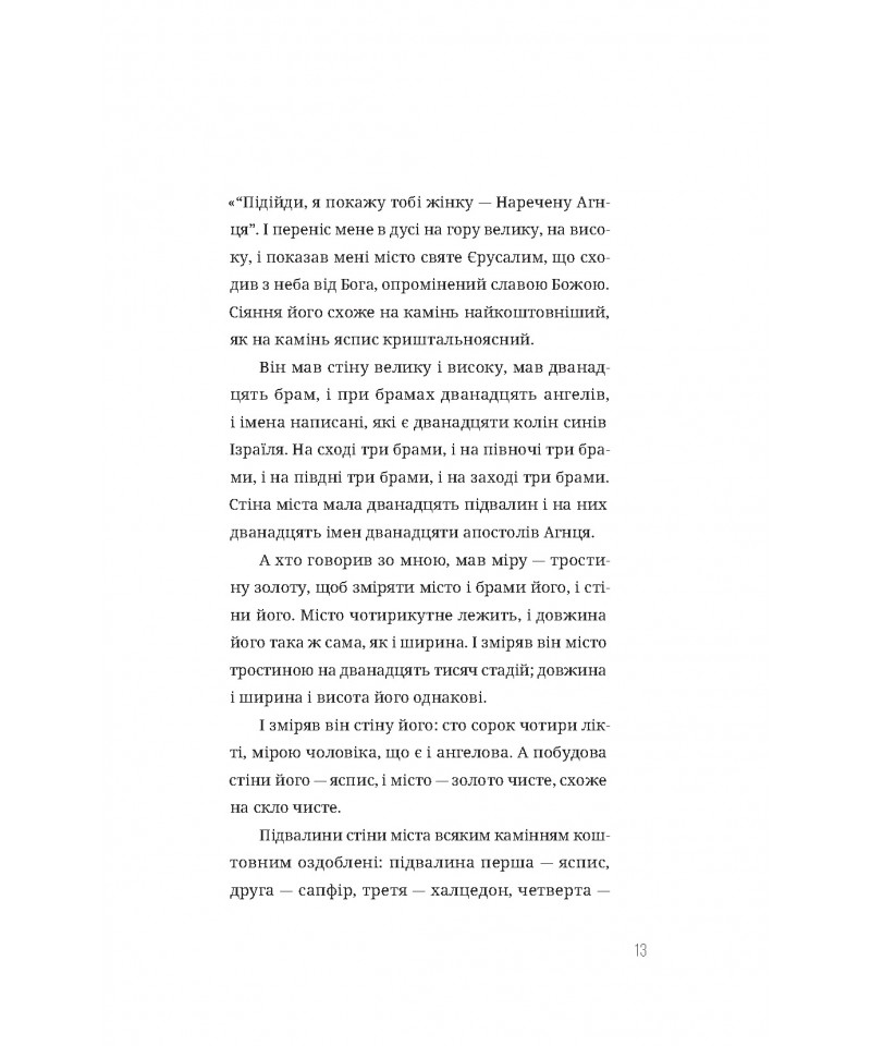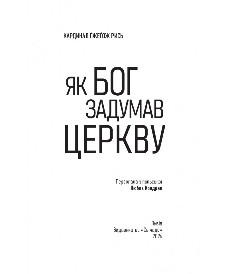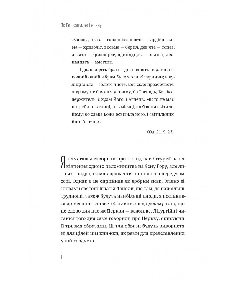 Кардинал Ґжеґож Рись - відомий автор і проповідник, один із тих, хто не боїться по-новому дивитися на Церкву, її проблеми та проектувати її майбутнє. У своїй новій книзі автор показує у трьох образах захопливу візію Церкви, якої хотів Бог. Він пише про місто, що спускається з неба, де живуть вільні й рівні між собою люди, про родину, яка створює нові кровні зв’язки, та про Наречену Агнця.